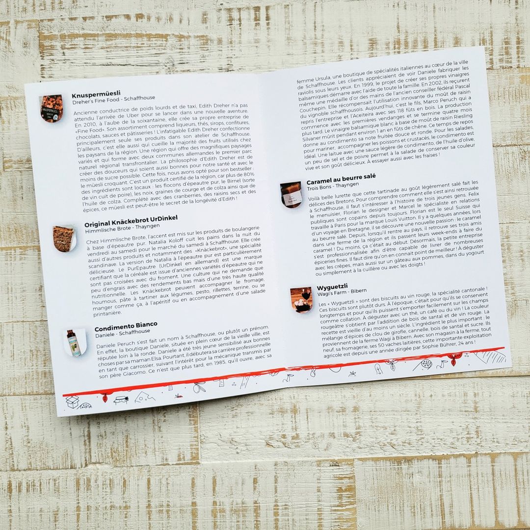 HelvetiBox, ce n’est pas seulement des produits culinaires suisses de qualité. Dans chaque HelvetiBox, vous trouverez un dépliant de dégustation avec la présentation des produits, des anecdotes gourmandes sur le terroir, des informations sur les producteurs et des conseils pour savourer chaque spécialité.